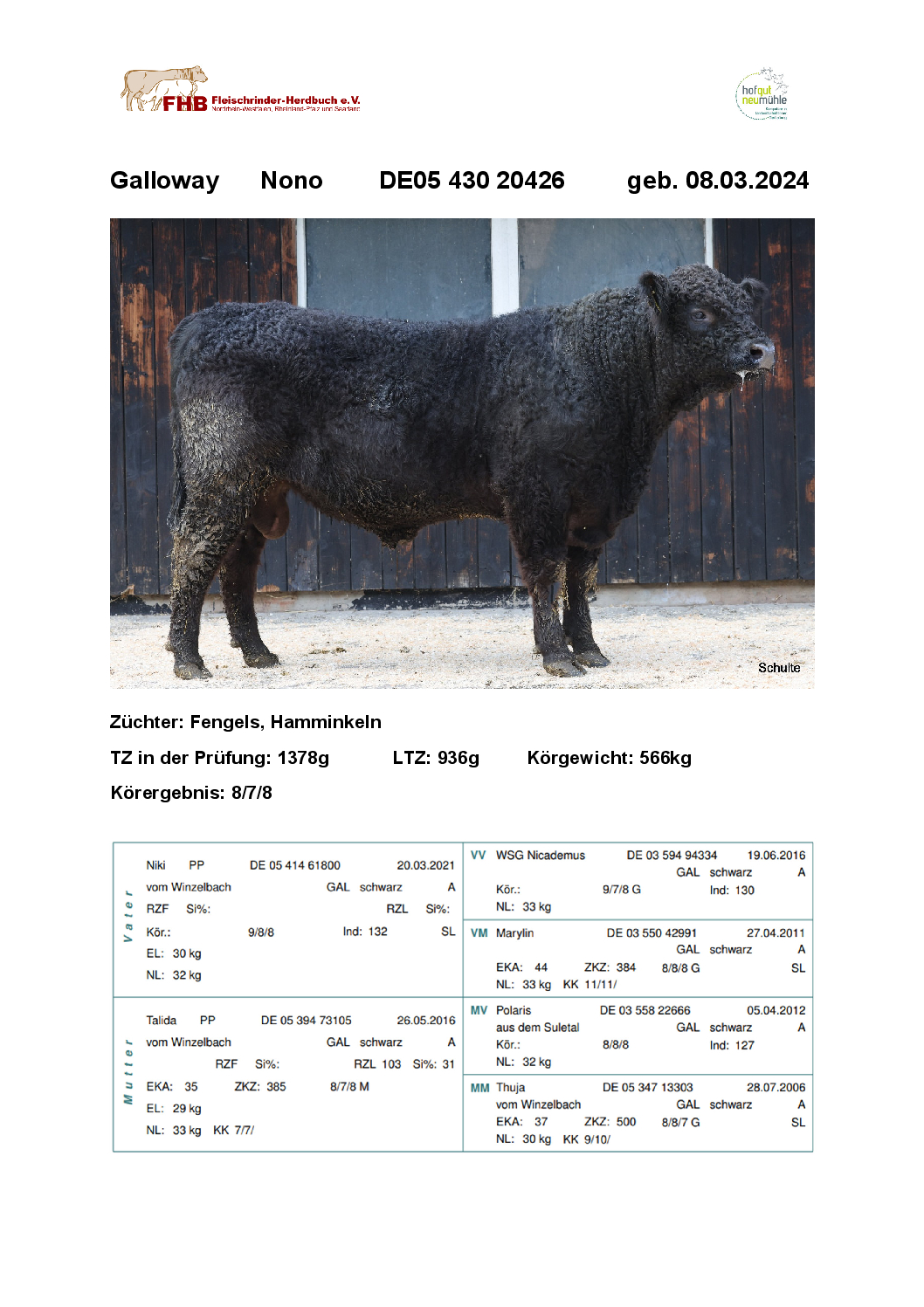 Sehr typvoller gekörter Jungbulle zu verkaufen. Nono vom Winzelbach hat sehr viel Typ und ein gutes Skelett und Fundament, er ist 1,5 Jahre und wurde mit 878 gekört, er hat ein aktuelles Gewicht von 566 kg, die Tageszunahmen betragen 936g LTZ, die Prüftageszunahmen betragen 1378g PTZ. Nono hat eine Super Abstammung, ist halfterführig und ruhig im Umgang zudem war er als 1 jähriger Jungbulle Reservesieger auf der FHB Schau in Krefeld. Aktuell (am 11.10.25) wäre ein Transport nach Absprache im Bereich Rheinland-Pfalz, Hessen oder NRW möglich.