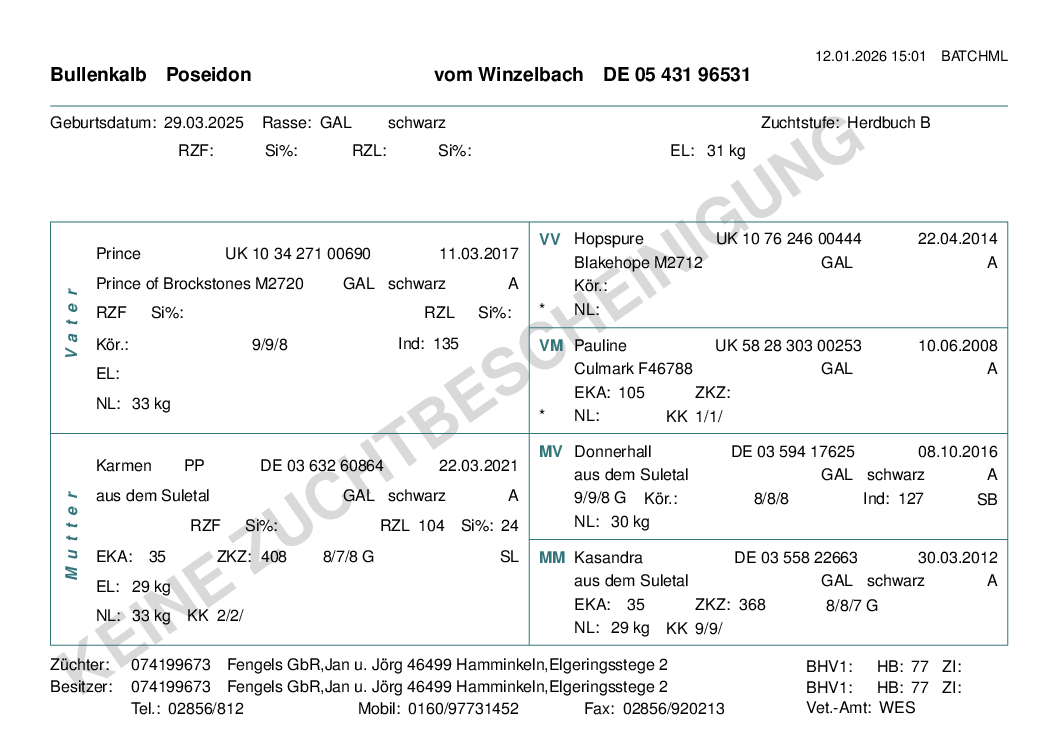 Sehr vielversprechender Bullenabsetzer zu verkaufen. Poseidon vom Winzelbach ist gut entwickelt, typvoll und korrekt im Skelett. Er hat eine sehr gute, interessante Abstammung. Vater ist der aus Schottland stammende Bulle Prince of Brockstones und Mutter ist Karmen aus dem Suletal ( eine Donnerhall Tochter) die als Färse Landessiegerin war.